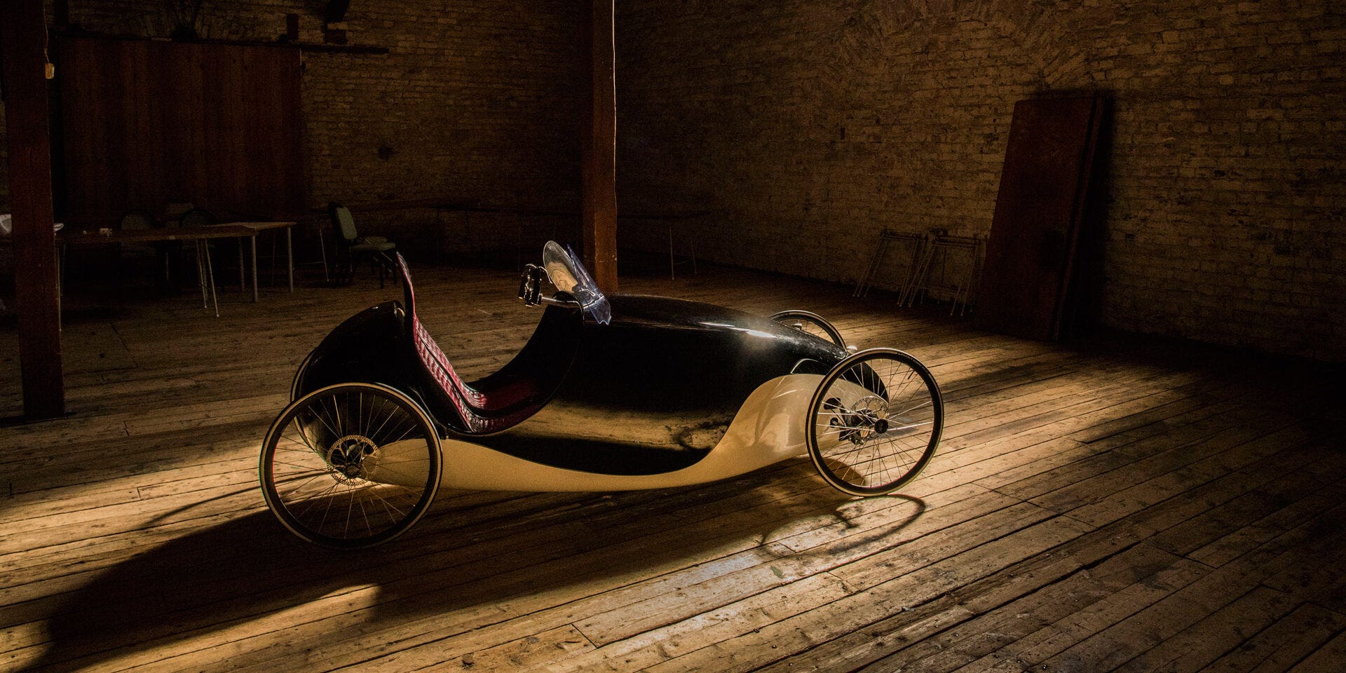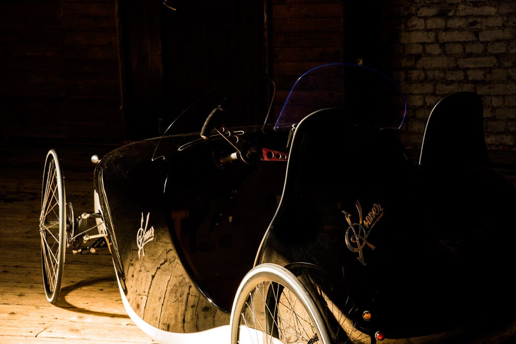 A ben guardare si potrebbe dire che questa Kinner potrebbe essere facilmente accostabile per metà ad una vetturetta e per metà ad una bicicletta (la rima non era voluta). Di certo c’è che questo mezzo, che potrebbe presto diventare realtà, fa del suo aspetto vintage una caratteristica assoluta ovviamente ispirata alle vetture di un tempo: carrozzeria bicolore e sedili imbottiti con rivestimento in pelle rossa trapuntata fanno il resto.