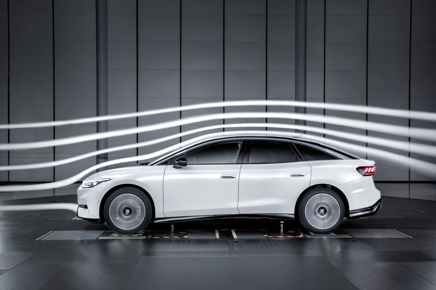 Con vetture dotate della tradizionale conformazione da berlina, come nel caso della nuova Volkswagen ID.7, la forma del corpo vettura rappresenta circa il 50% del valore del coefficiente di resistenza (Cd o Cx) dichiarato. Le ruote e gli pneumatici influenzano il dato per il 30%, il fondo il 10% e le aperture funzionali attraverso le quali l’aria fluisce verso i radiatori nella parte anteriore del veicolo, ad esempio, pure un valore pari al 10%. Il fatto che la nuova Volkswagen ID.7 sia la variante della famiglia ID. più aerodinamica finora proposta da Volkswagen, può essere visto a prima vista guardando la sagoma della vettura che è lunga quasi cinque metri. Il designer di Volkswagen, Daniel Scharfschwerdt, ha ammesso che durante la fase di progettazione della ID.7, lo sviluppo si è concentrato maggiormente sull’aerodinamica rispetto a praticamente qualsiasi altro modello finora realizzato da Volkswagen. Questo approccio si può apprezzare nella parte anteriore bassa, nella transizione fluida del cofano e del parabrezza, ma anche nella forma stessa del tetto simile all’impostazione tipica di una coupé: “la parte posteriore affusolata è stata progettata per ottenere prestazioni aerodinamiche ideali”, ha aggiunto Scharfschwerdt.