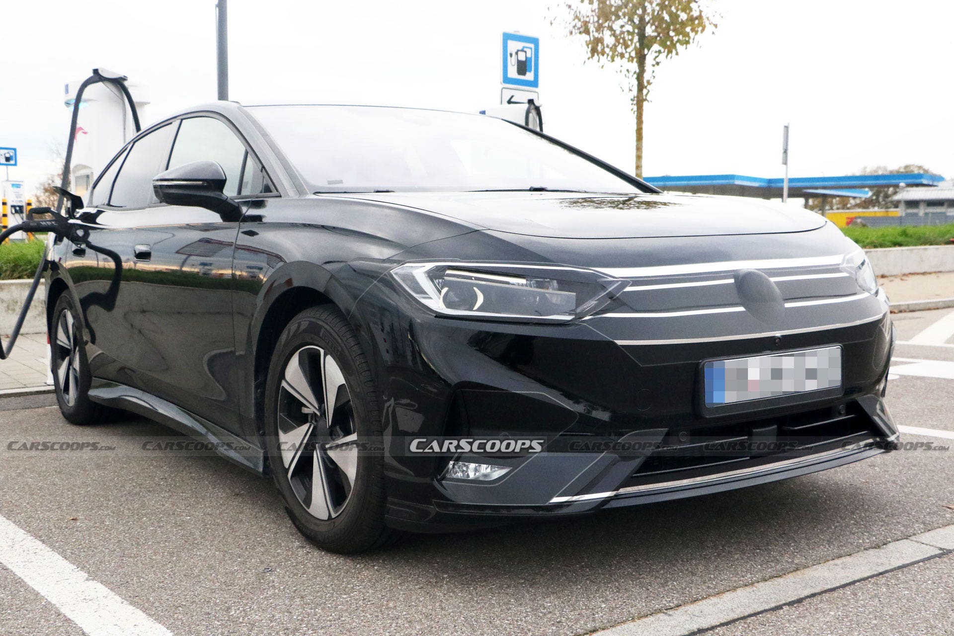 Almeno a giudicare da queste immagini della Volkswagen ID.7, i suoi sinuosi parafanghi anteriori e posteriori chiedono a gran voce l’utilizzo di cerchi ruota più grandi per riempire quegli archi. A difesa delle linee definitive che caratterizzeranno questa elettrica, la parte anteriore e posteriore di questo prototipo sono ricoperte da un travestimento progettato per oscurare i fari anteriori e uno stretto pannello della griglia che sembrerà molto più fresco quando l’auto finale verrà rilasciata, riecheggiando ancora da vicino lo stile della ID. Aero Concept.