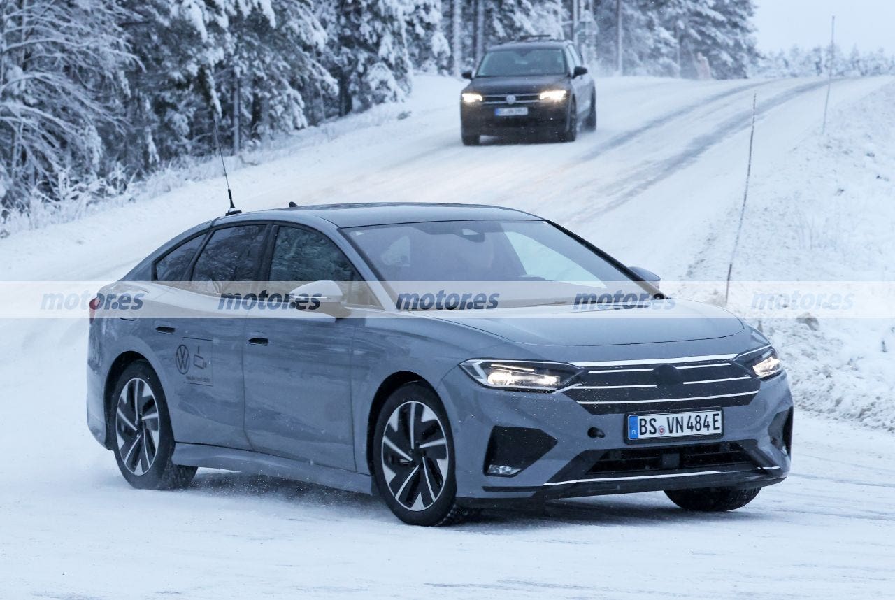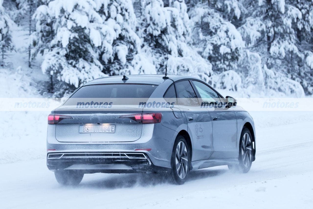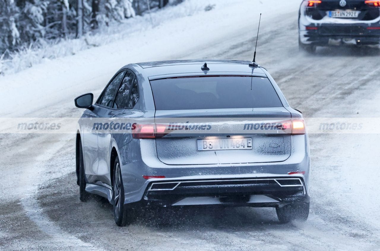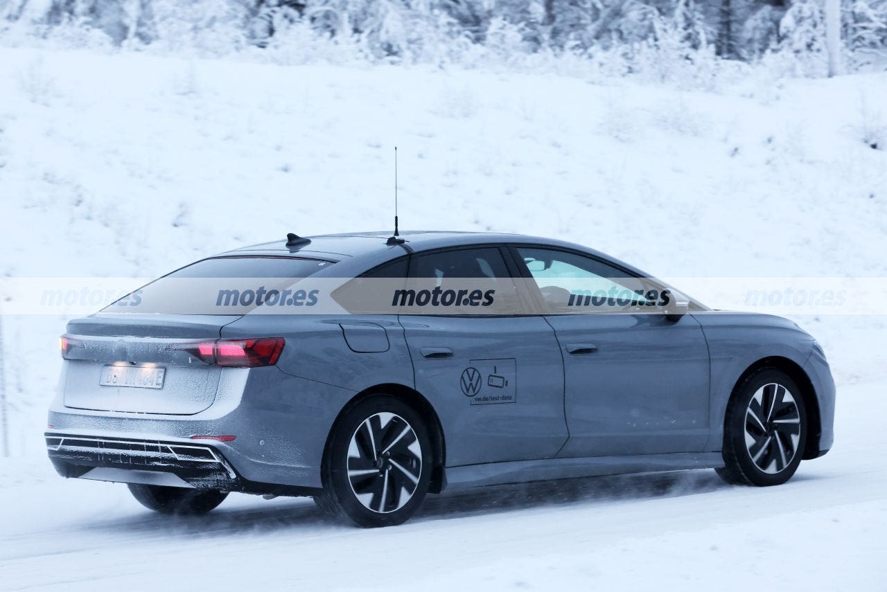 Le foto spia continuano a mostrare un lunotto leggermente mimetizzato alloggiato nel montante posteriore, nonostante la ID.7 vista presso la grande fiera americana dell’elettronica abbia già confermato quello che abbiamo visto da quando è iniziata la sua messa a punto: la sua forma a triangolo. Il fianco mostra proporzioni equilibrate. Lo sbalzo anteriore corto presenta un cofano a conchiglia e la parte posteriore è più lunga per aumentare la capacità del bagagliaio. Anche i fanali dispongono di un aspetto più convenzionale, il che non significa che siano anche uniti.