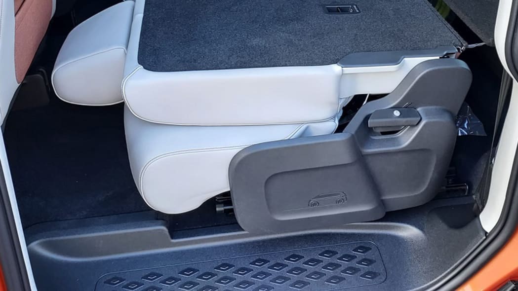I sedili sono disposti tradizionalmente davanti, mentre il comparto posteriore è interessato da un classico divano frazionato: niente sedili singoli quindi. È interessante notare che questa versione del Volkswagen ID.Buzz pare essere una variante dotata di due sole file di sedili, poiché difatti non si notano cinture di sicurezza per la terza fila e la piattaforma posteriore non sembra nascondere i sedili. Quelle piattaforme disposte nel bagagliaio consentono però di avere un pianale di carico piatto con i sedili della seconda fila ripiegati. Non è chiaro se i sedili della seconda fila siano rimovibili, ma scorrono e si reclinano. Le piattaforme posteriori sembrano essere rimovibili in modo che gli oggetti più alti possano stare in posizione verticale agevolmente. Immaginiamo che con le piattaforme in posizione e i sedili posteriori abbassati, questo sarebbe un ottimo layout per allestire una sorta di bivacco per le attività di campeggio.