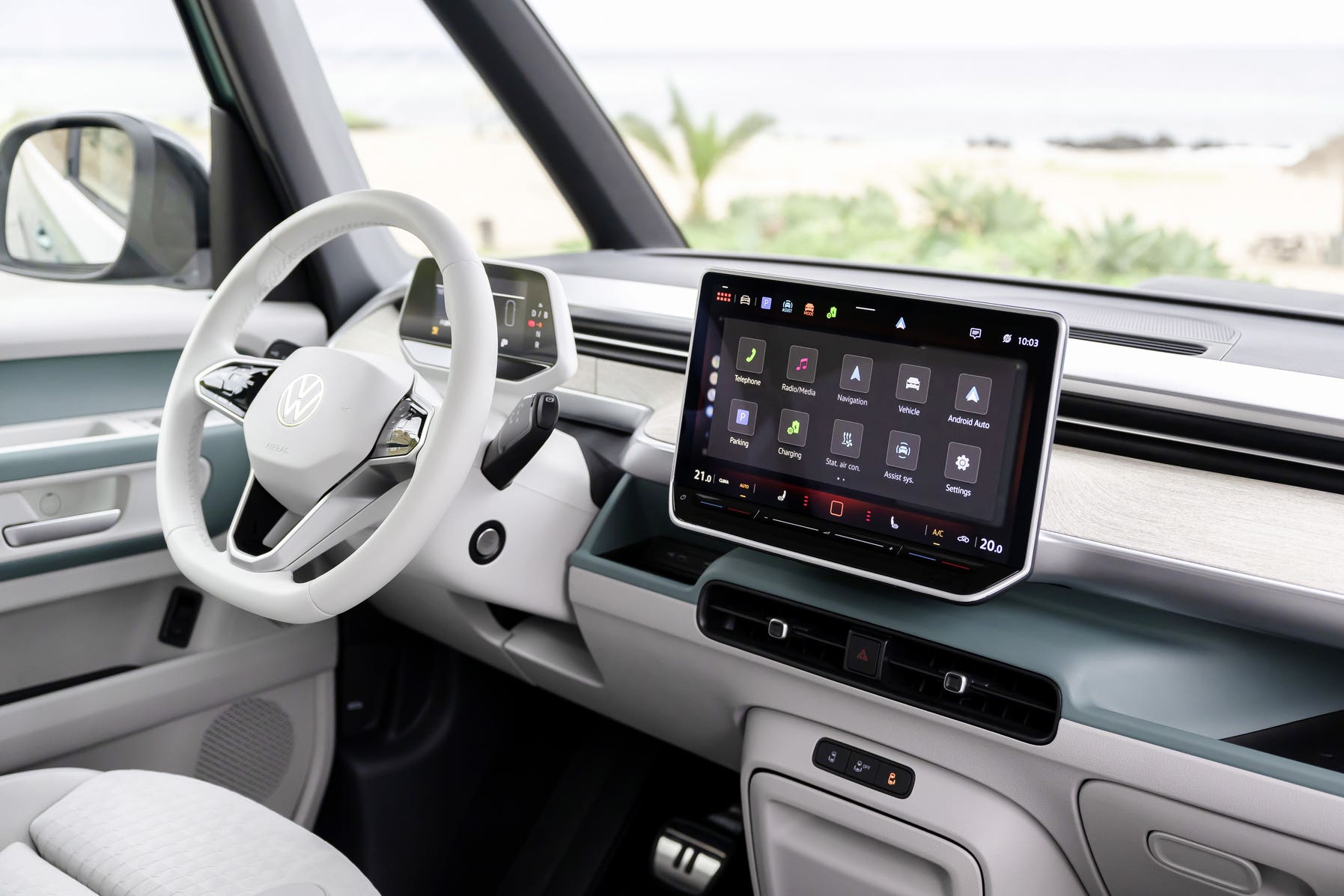 Altre nuove funzionalità del Volkswagen ID. Buzz a passo lungo includono un head-up display, un sistema di infotainment di nuova generazione aggiornato e possibilità di parcheggio remoto utilizzabile mediante smartphone. Nel frattempo, un tetto panoramico high-tech di nuova concezione con vetro intelligente riporta alla mente i ricordi del leggendario Samba Bus degli Anni ’50. Con i suoi 1,5 metri quadrati, è il tetto in vetro più grande mai costruito da Volkswagen. Questo smart glass può essere cambiato da trasparente a opaco e viceversa utilizzando lo slider touch o l’assistente vocale; le versioni per il Nord America presenteranno anche sedili climatizzati e il logo Volkswagen illuminato sulla parte anteriore.